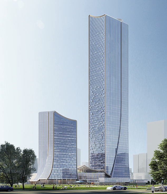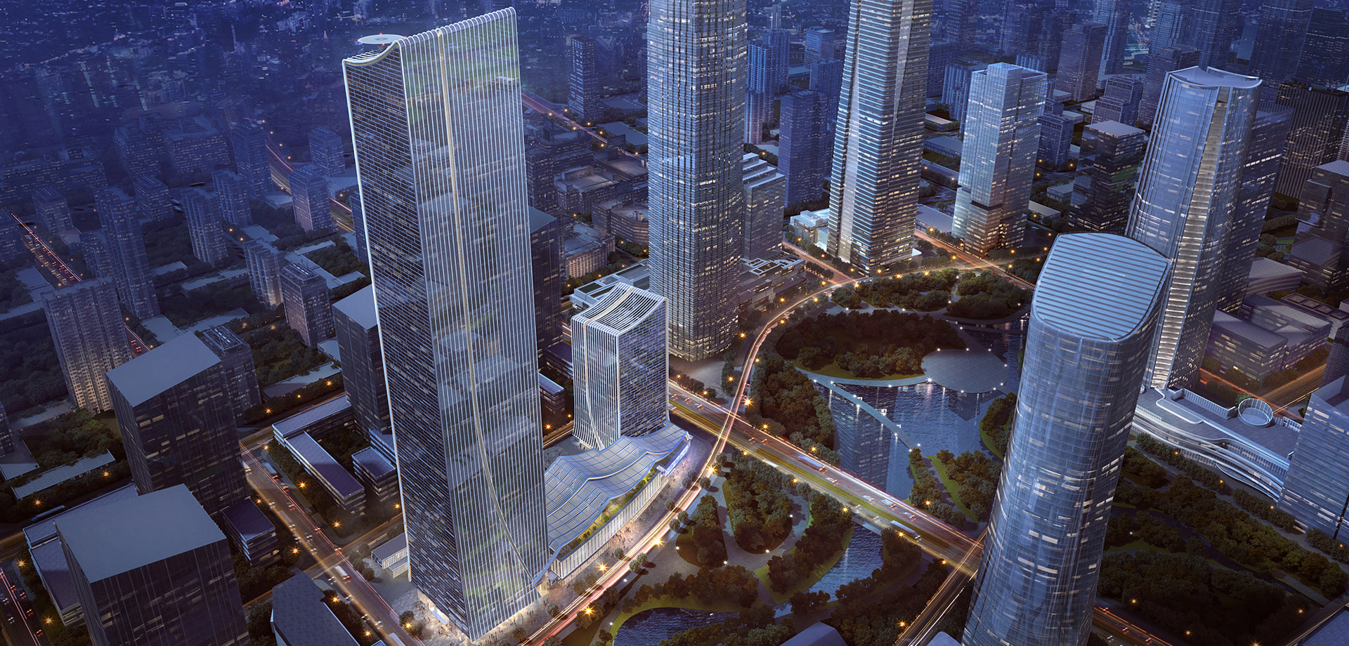 建筑高度:326.1m(65层) 幕墙面积:7.1万m2 项目设计:Aedas建筑设计事务所 幕墙类型:单元式玻璃幕墙等
